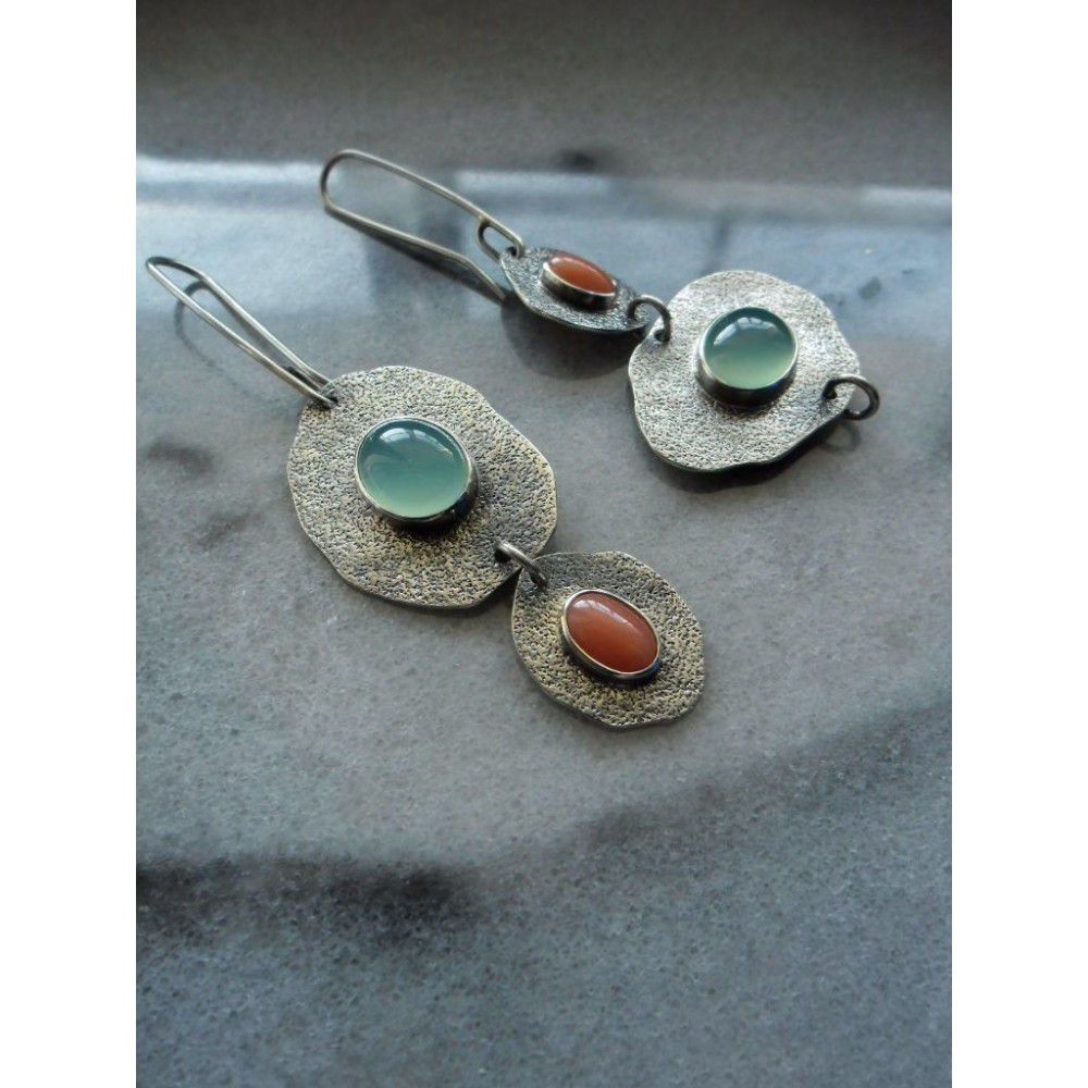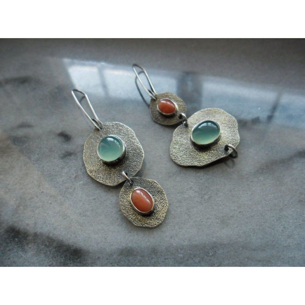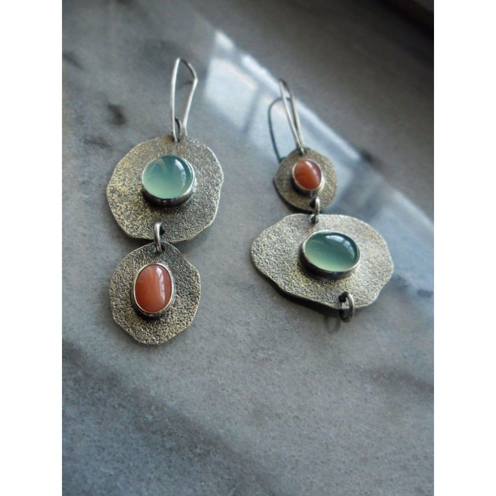 Rongyu Bohemian Mint chalcedony and Artificial Coral Earrings creative asymmetric Vintage Silver Earrings