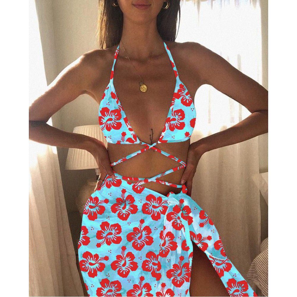 European and American New Three Piece Bikini tie dyed printed lanyard shawl swimwear cross border wholesale women's swimwear